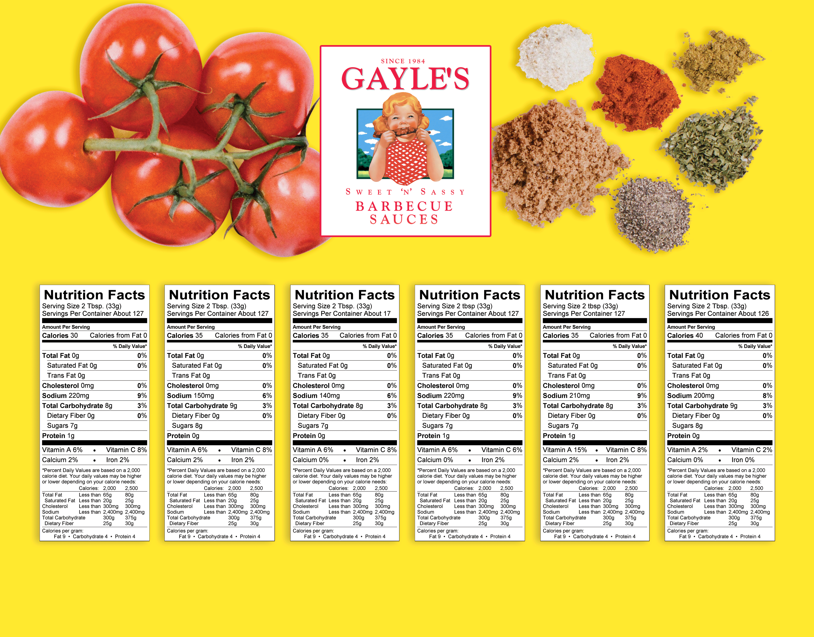 Gayle’s BBQ Sauces are FAT FREE – TRANS FAT FREE – GLUTEN FREE - CHOLESTEROL FREE & have no saturated fats, preservatives or extenders. |